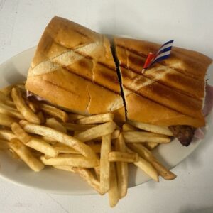 Una combinación deliciosa de croquetas doradas y crujientes, llenas de deliciosos sabores, con capas de jamón y queso, y complementadas con mostaza picante y pepinillos. Servido en un pan fresco, este sándwich ofrece una deliciosa combinación de texturas y sabores, lo que lo convierte en un clásico cubano que no olvidará.